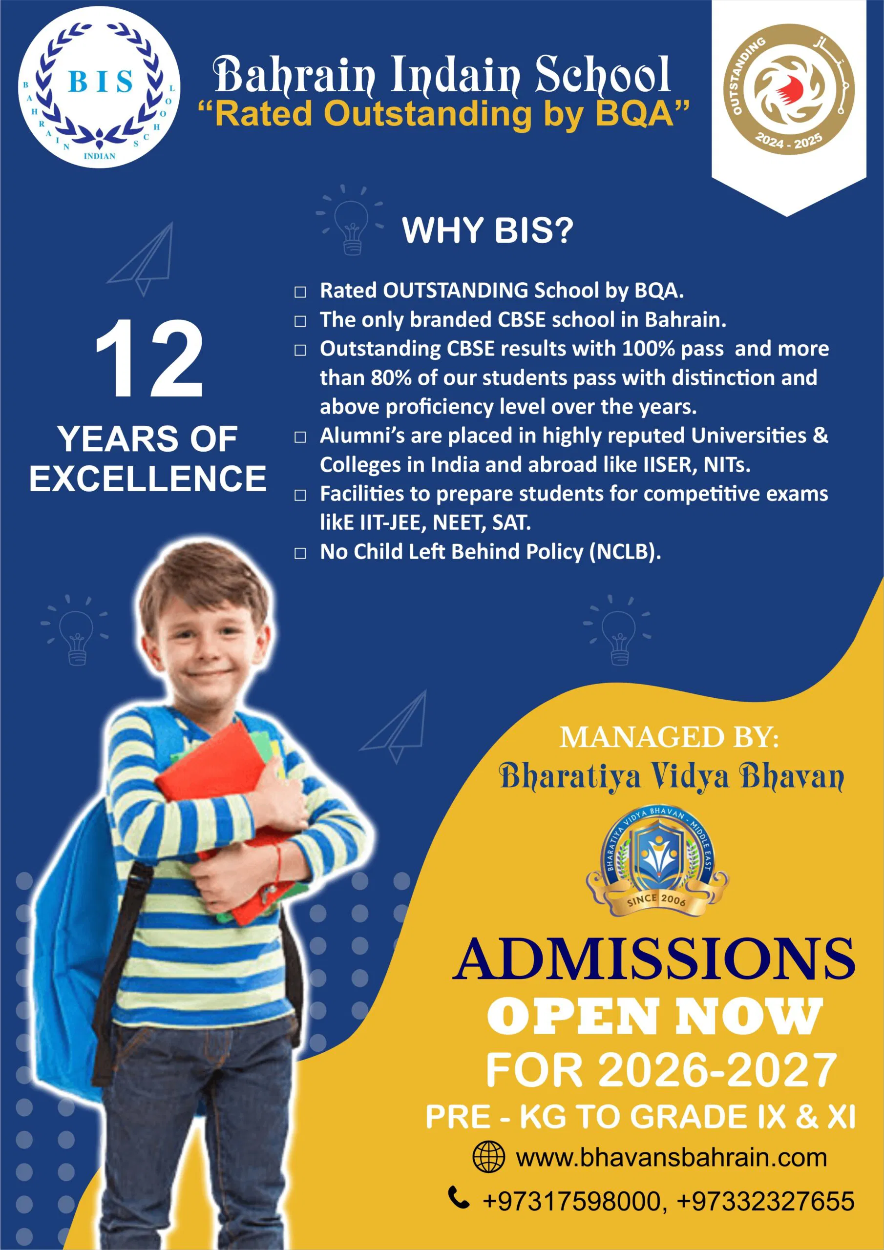 One of the best CBSE Schools in Bahrain. Bahrain Indian School is managed by accomplished personalities with a proven track record of crafting the lives of over 12000 proud Bhavanites.